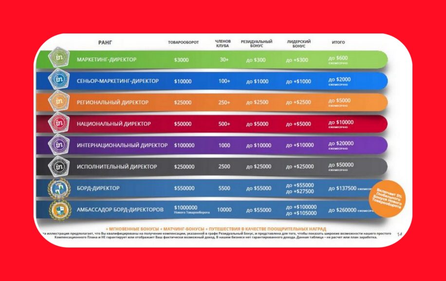 Кроме того, InCruises действует по MLM-схеме, что автоматически позволяет причислить организацию в разряд пирамид. Достаточно взглянуть на схему рангов, которые есть в структуре: кто больше привлечёт новых людей, тот сам получит выше ранг и больше заработает. В структуре InCruises только на уровне директоров есть 8 рангов (от «маркетинг-директора» до «амбассадора борд-директоров», не говоря о руководителях всей организации Майкле Хатчисоне и Франке Кодине.