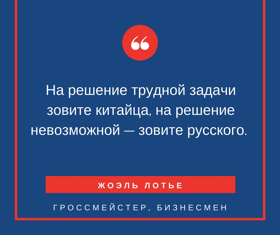 Знаменитая цитата Жоэля Лотье ЖОЭЛЬ ЛОТЬЕ ГРОССМЕЙСТЕР, БИЗНЕСМЕН: «На решение трудной задачи зовите китайца, на решение невозможной — зовите русского».