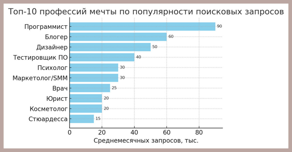 Примечание: Помимо перечисленных, в поиске фигурируют и другие профессии (актёр, учитель, пилот, предприниматель и др.). Однако они уступают по частоте вышеназванным. Например, согласно опросам, многие родители хотели бы видеть детей инженерами и учёными, однако в поисковых запросах эти общие категории реже формулируются напрямую (люди ищут конкретные направления, такие как программирование или авиация). Тем не менее инженерные и научные специальности присутствуют косвенно: например, инженер популярен через смежные IT-запросы, а интерес к науке выражается через запросы об обучении в аспирантуре и т.д.