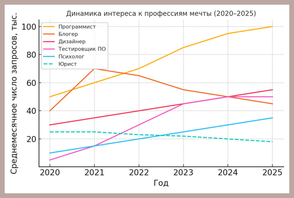 Учитывалась статистика за 2020-2025 годы, как точные фразы (например, «хочу стать дизайнером»), так и любые запросы, связанные с профессиями («как стать…», «профессия…» и т. д.).