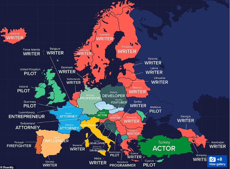 Поисковые запросы «как стать пилотом» и аналогичные запросы лидируют в 25 странах, включая Великобританию, США и Австралию, с общим числом поисков 930 630. «Писатель» занимает второе место с 801 200 поисковыми запросами, но лидирует в 75 странах, включая Индию, Новую Зеландию и Южную Африку.
