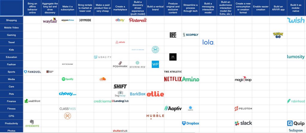 Эрик Стормберг (Eric Stormberg), основатель Oyster, теперь работающий в Google, создал матрицу идей для стартапа (The Startup Idea Matrix), в которой каждый может примерить на себя ту или иную модель, причём, наверное, не только в интернете, но и в обычном бизнесе.