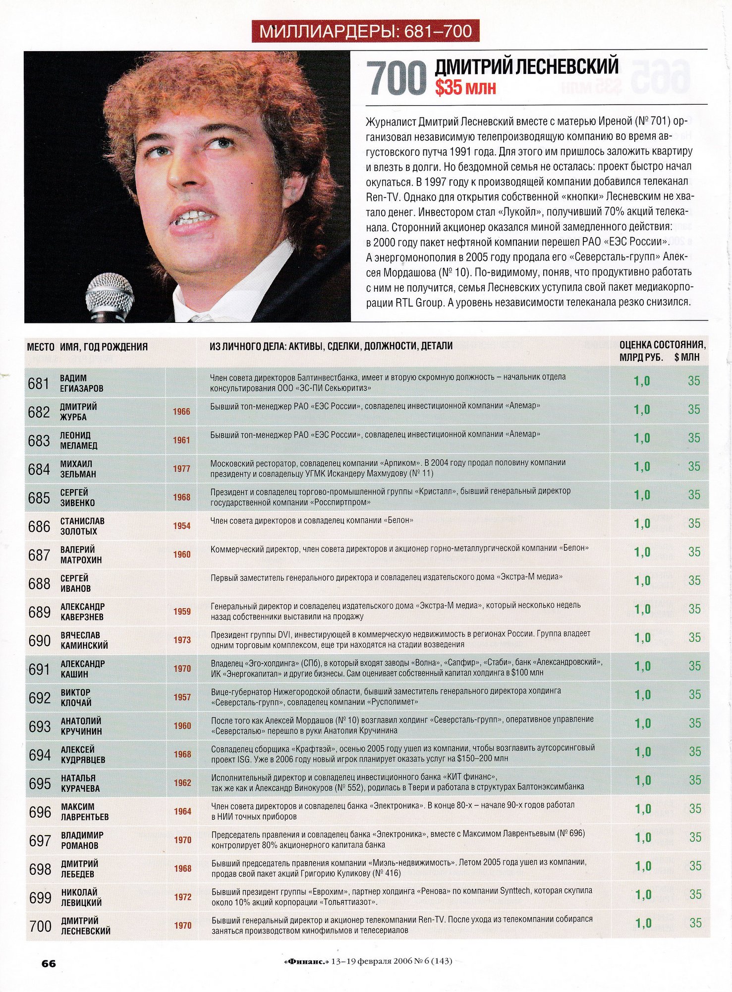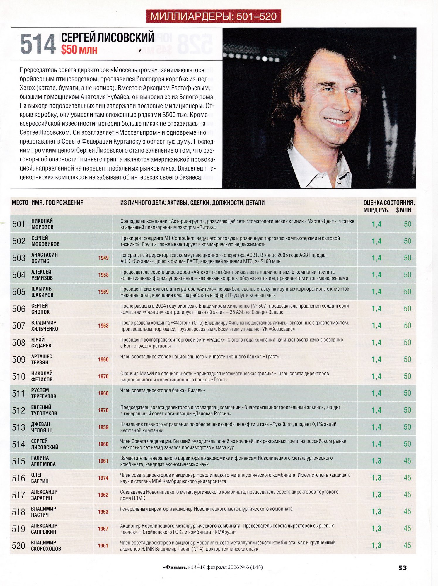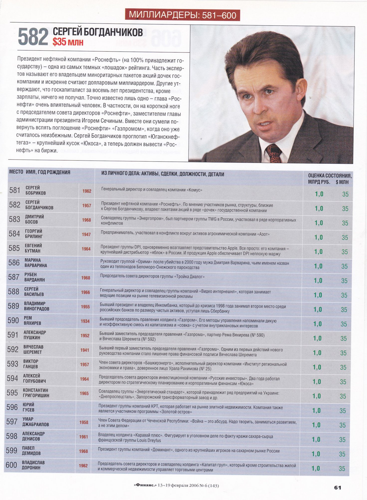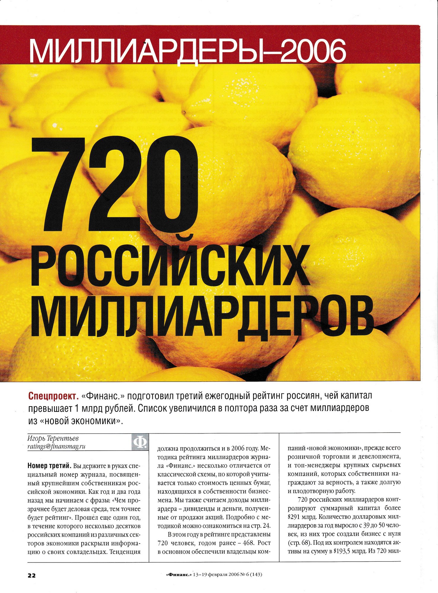 Рейтинг российских миллиардеров — 2006. 720 персон. Журнал «Финанс.»