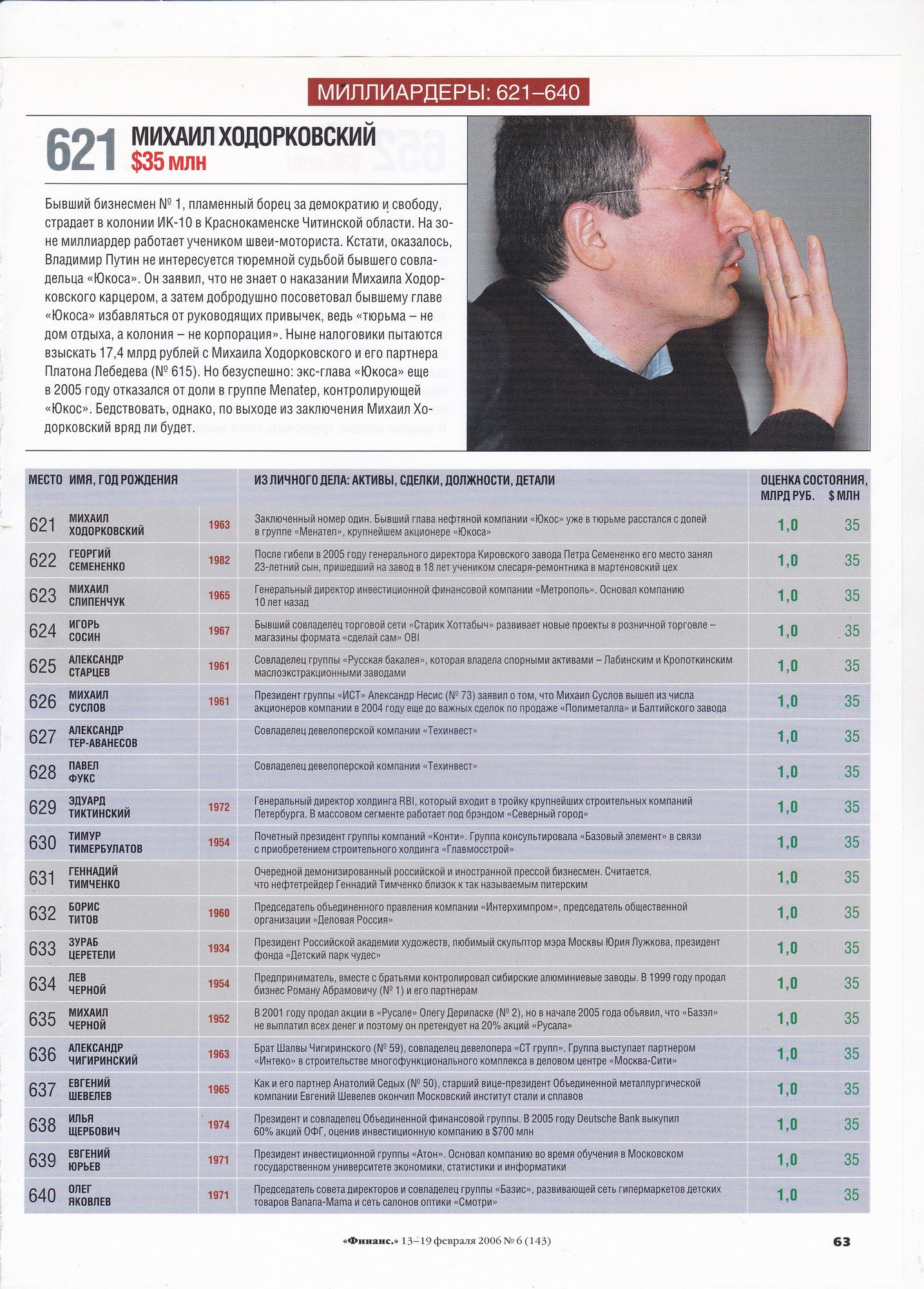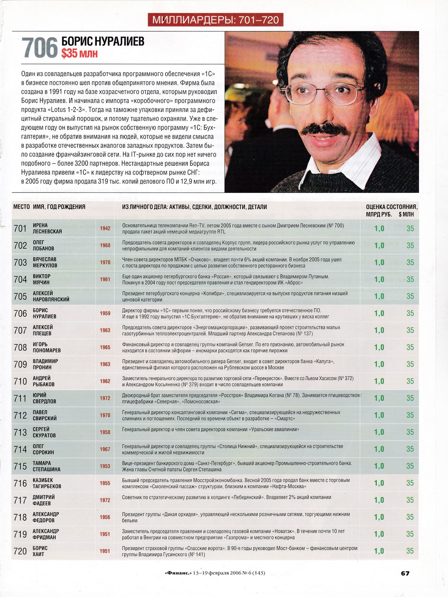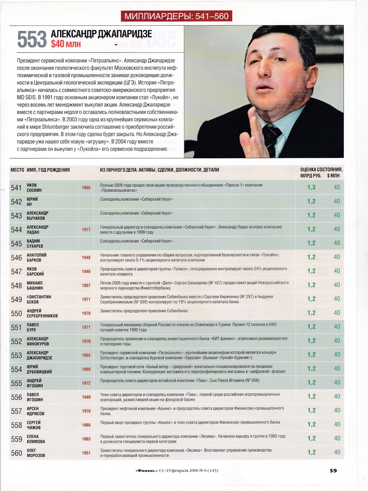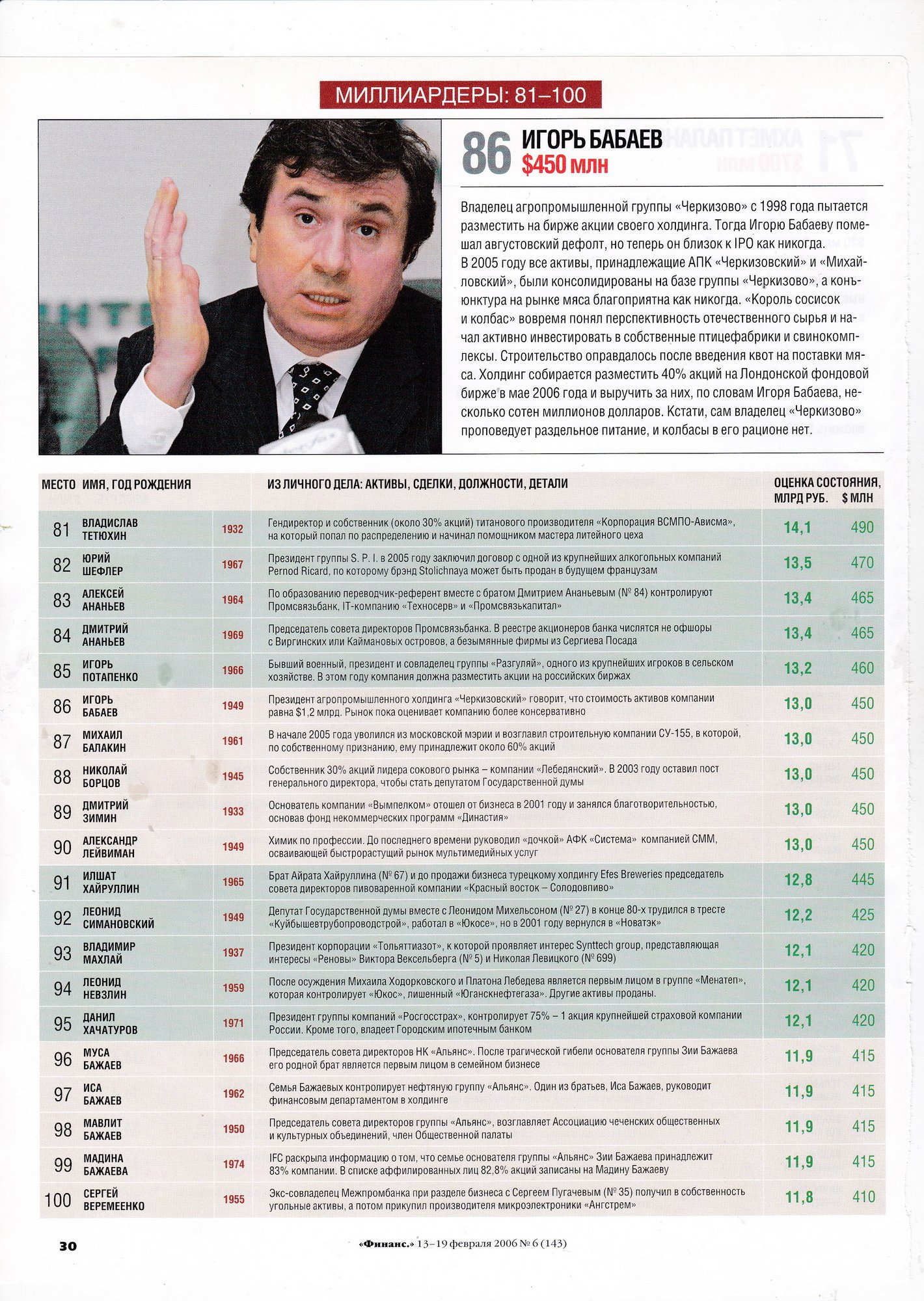 Рейтинг российских миллиардеров — 2006. 720 персон. Журнал «Финанс.»