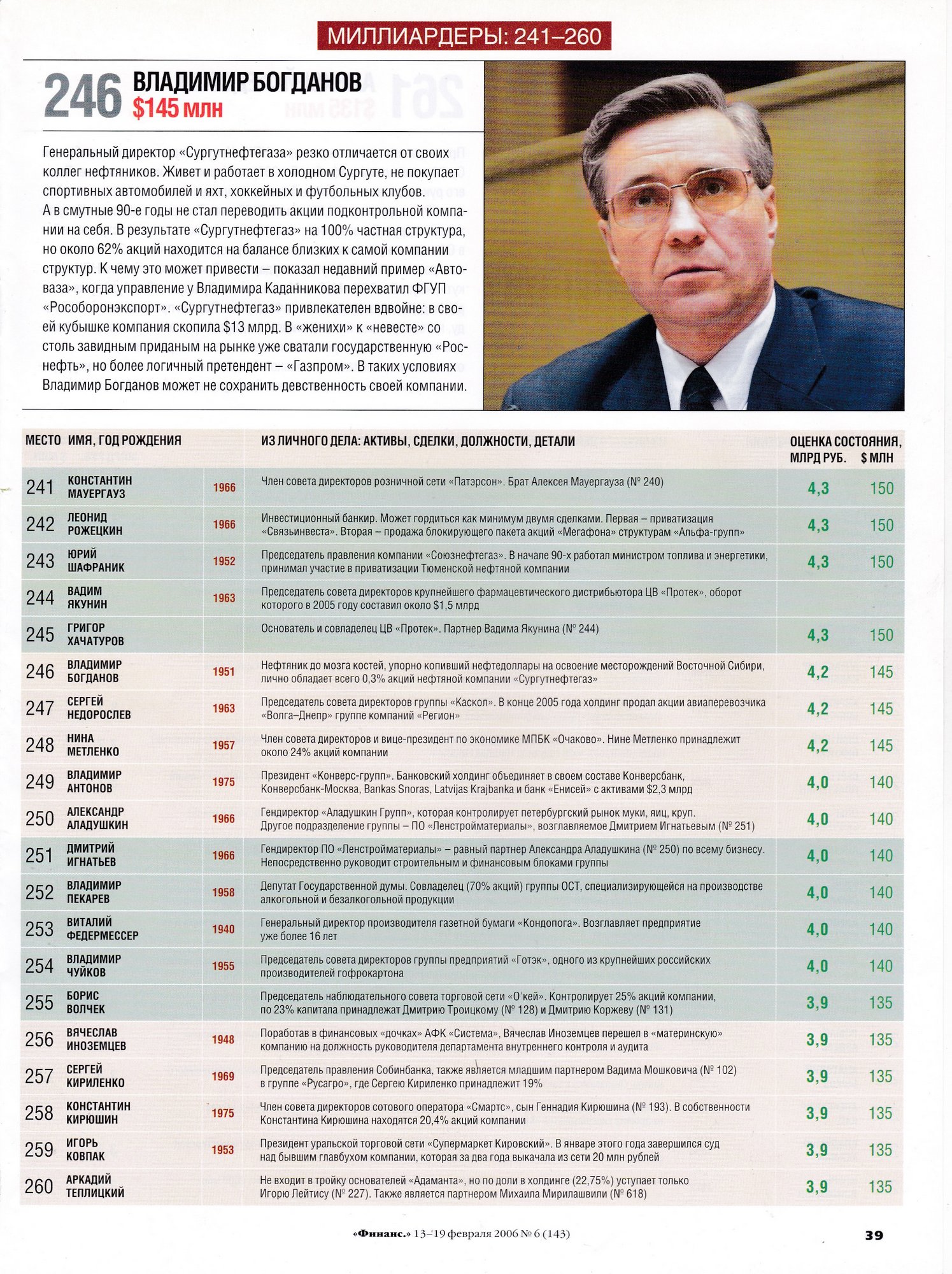 Загадки «черного золота». Несмотря на то что общее количество долларовых миллиардеров за год увеличилось с 39 до 50, рейтинг «потерял» одного из них. Глава «Сургутнефтегаза» Владимир Богданов ($145 млн) после каждой публикации, где он занимал верхние места в списках богатейших людей, заявлял, что это неправда. И теперь мы с ним полностью согласны. Несомненно, глава «Сургута» богат: принадлежащие ему 0,3% на момент оценки стоили $145 млн. Контрольный пакет акций «Сургутнефтегаза» по-прежнему висит в воздухе: числится на структурах, близких к самой компании. Но 2005 год показал, что его достаточно быстро можно вернуть обратно на землю. «Автоваз», на котором похожая картина с собственностью, перешел под контроль государственного «Рособоронэкспорта».