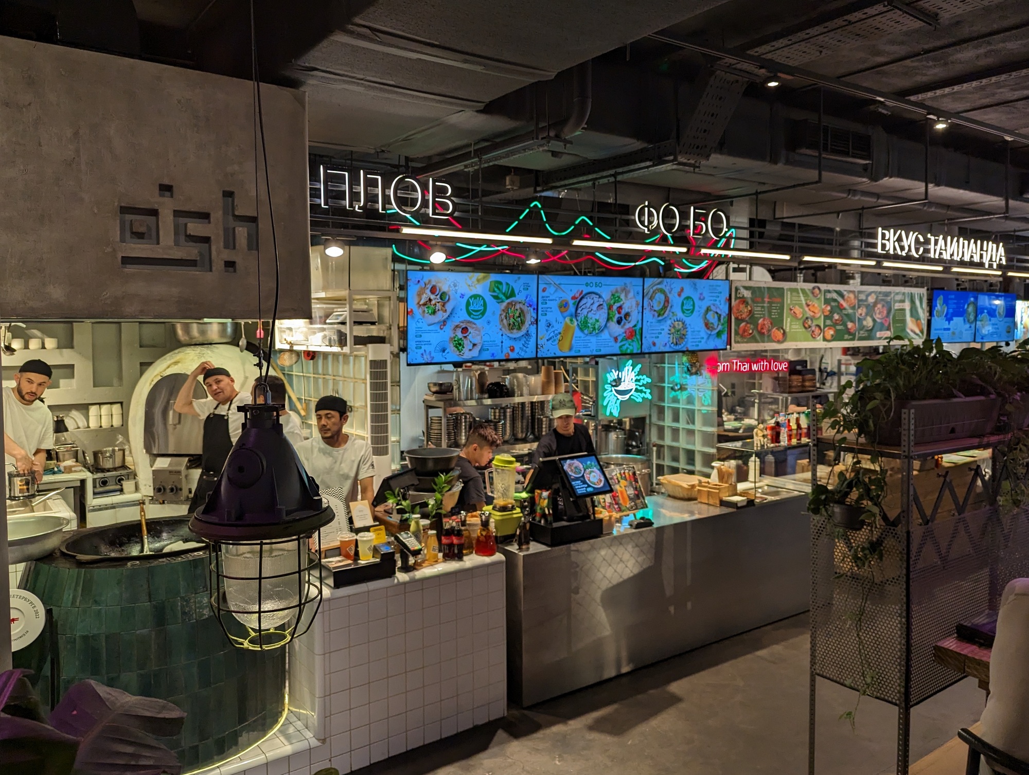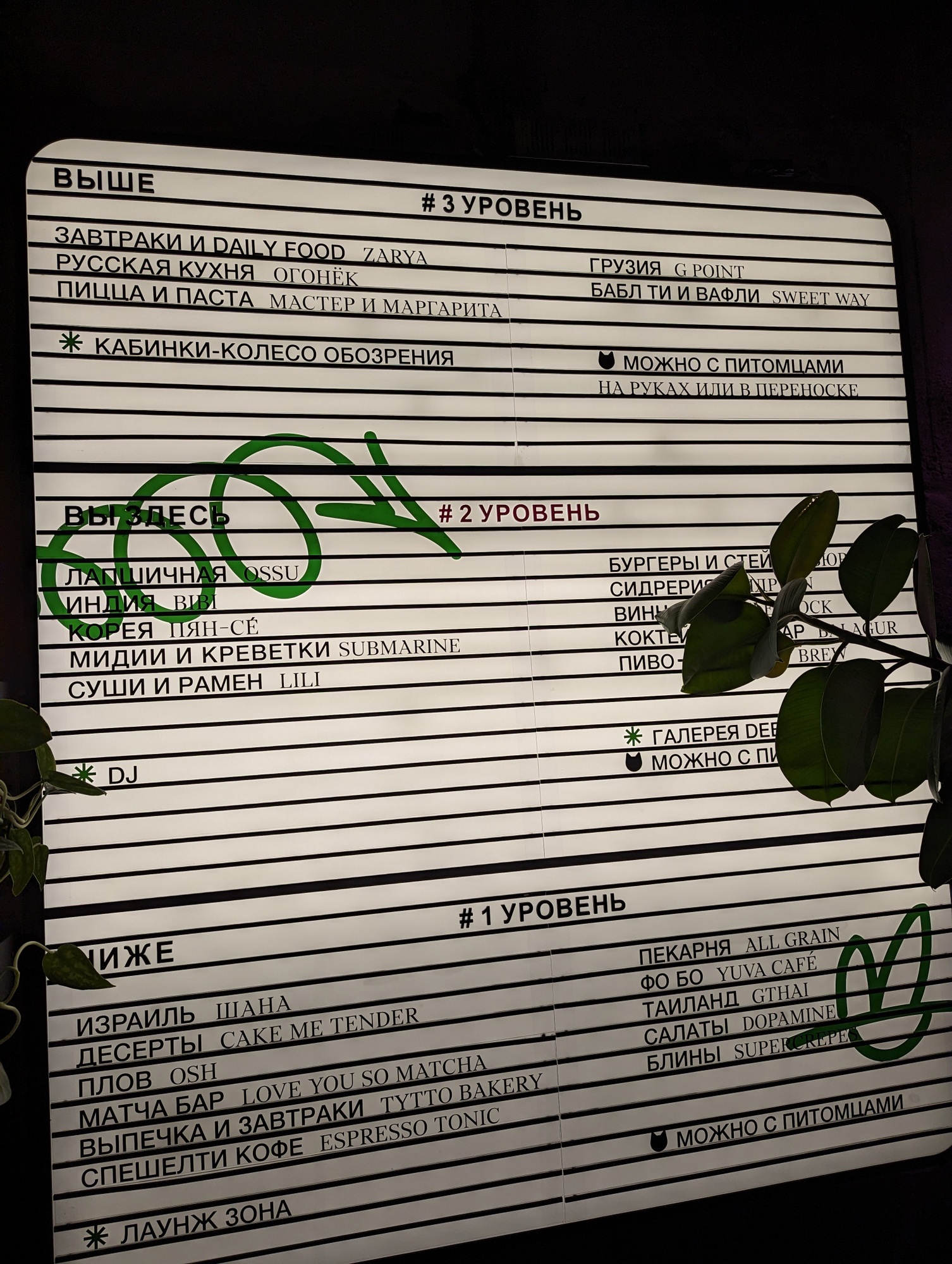 Ближний восток Sapiens, фо бо Yuva Café, Gthai, плов Osh, суши и рамен Lili, индия Bibi, Корея Пян-се, Мексика, лапшичная Ossu, пиво и напитки AF Brew, коктейльный бар Balagur, морепродукты Submarine, винотека Bottleshock, сидрерия Сидр и n, бургеры и стейки Бюро, завтраки и смарт фуд Zarya, пицца и паста Мастер и маргарита, русская кухня Огонёк, Грузия G Point, бабл ти и вафли Sweet Way, завтраки и выпечка Tytto, пекарня All Grain, матча бар Love You So Matcha, десерты Cake me tender, Израиль Шана, конфеты Культура, спешелти кофе Espresso Tonic, салаты Dopamine, блины Supercrepes.