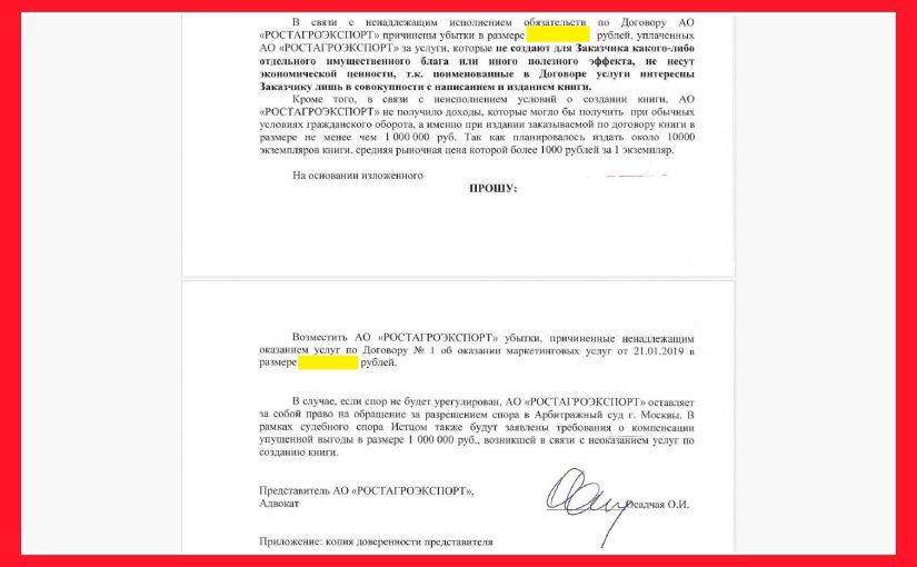 И угрожает взысканием упущенной выгоды: «В случае, если спор не будет урегулирован, АО «РОСТАГРОЭКСПОРТ» оставляет за собой право на обращение за разрешением спора в Арбитражный суд г. Москвы. В рамках судебного спора Истцом также будут заявлены требования о компенсации упущенной выгоды в размере 1 000 000 руб., возникшей в связи с неоказанием услуг по созданию книги».