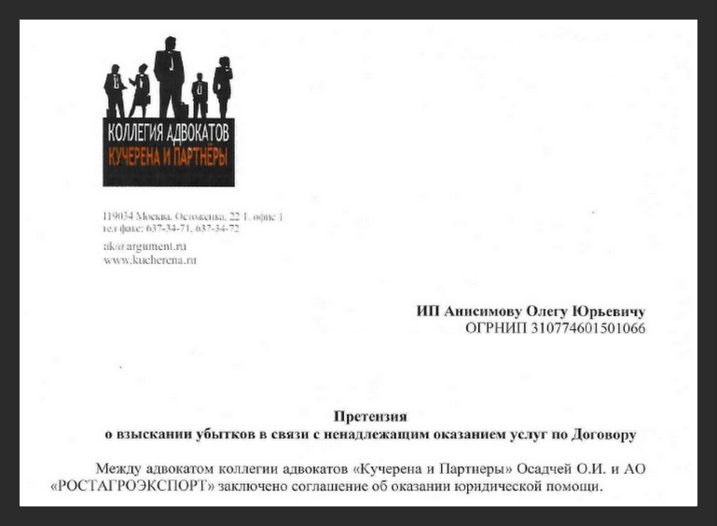 Контрагент моего ИП — АО «Ростагроэкспорт» — не заплатил за работу. Выполненную в соответствии с договором. На контакт не выходил. Начал процесс ликвидации юрлица. Я подал иск в суд. Контрагент для отпора мне нанял не просто юриста, а целого адвоката из коллегии «Кучерена и партнёры». Зовут Оксана Осадчая. Регистрационный номер 77/8236 в реестре адвокатов г. Москвы.