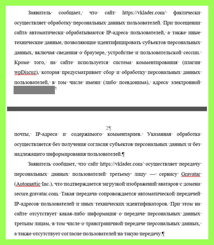 В-третьих, «заявитель сообщает, что сайт осуществляет передачу персональных данных пользователей третьему лицу — сервису Gravatar (Automattic Inc.), что подтверждается загрузкой изображений аватаров с домена secure .gravatar. com. Такая передача сопровождается автоматической передачей IP-адресов пользователей и иных технических идентификаторов».