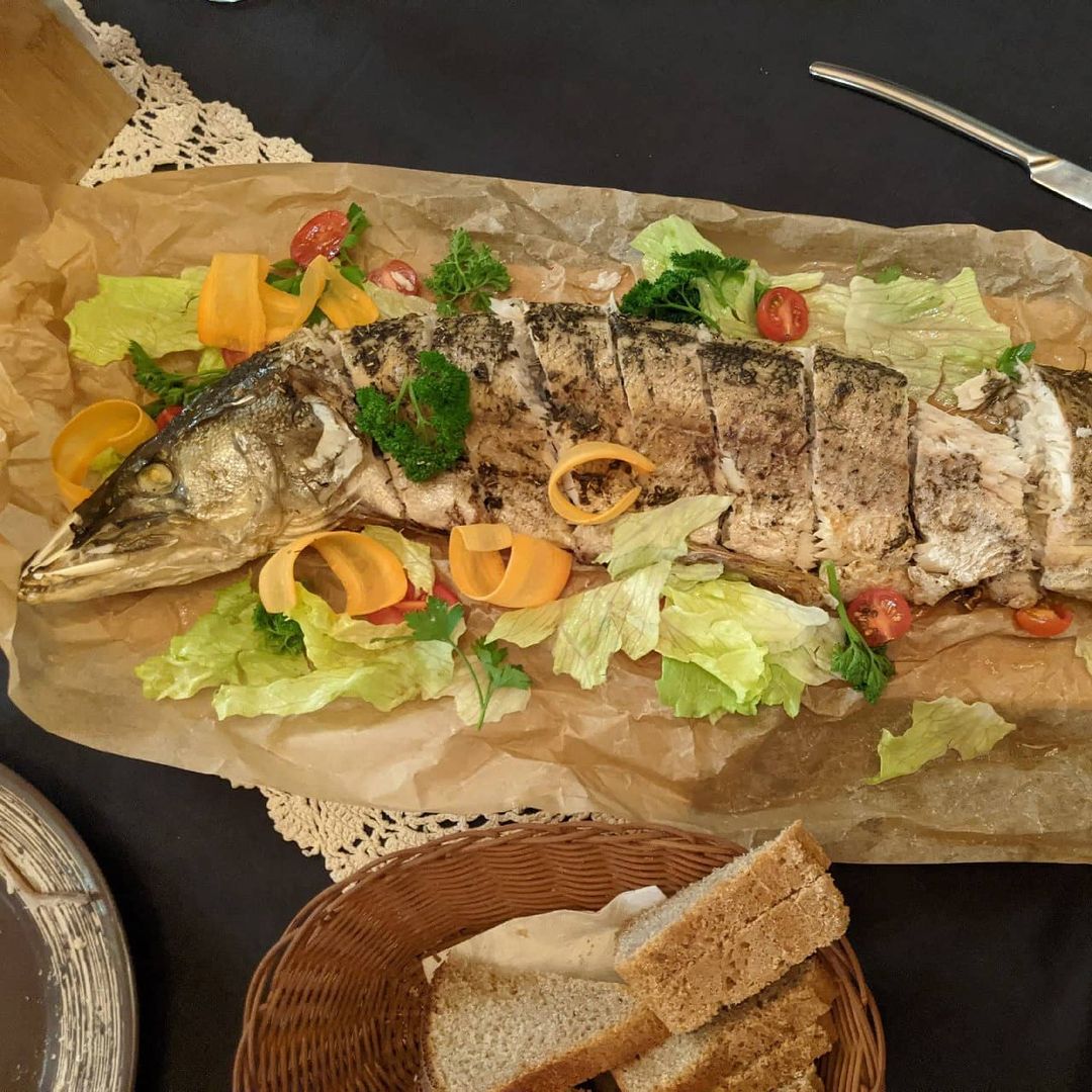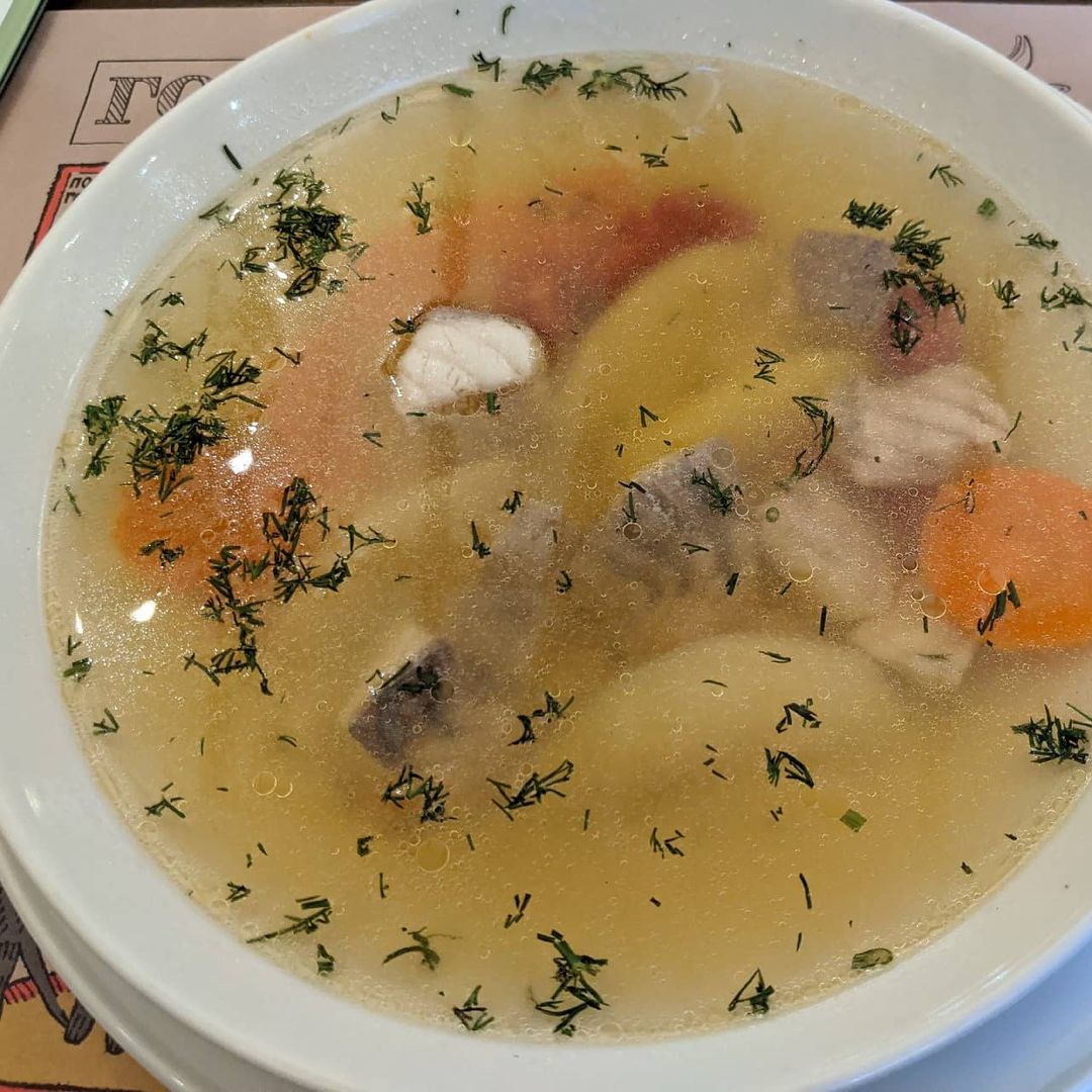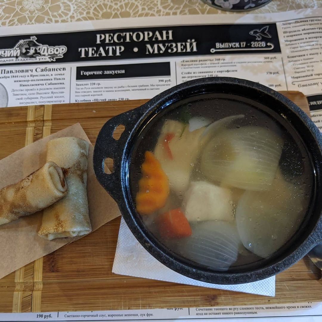 Уха щучья на русский манер с блинами, чинёными белым мясом цыплёнка.