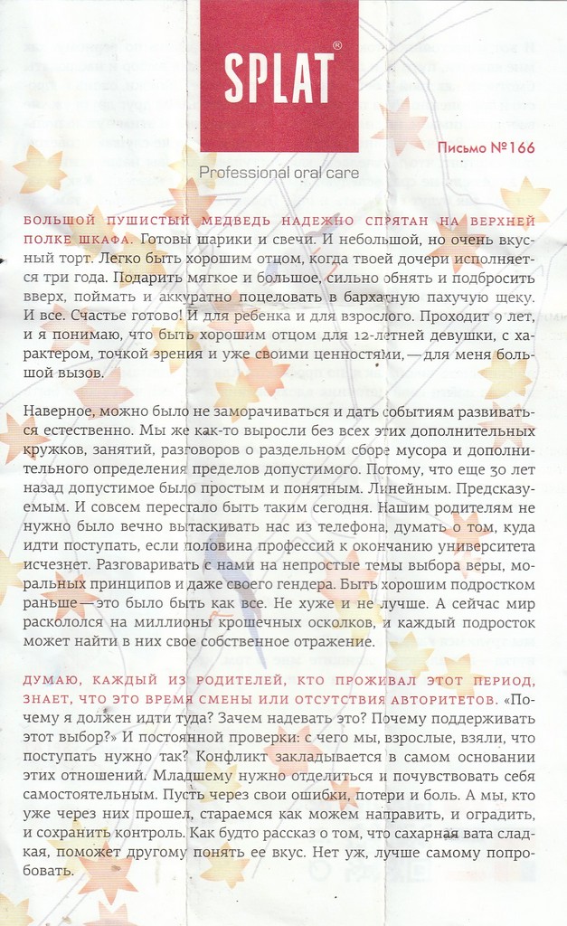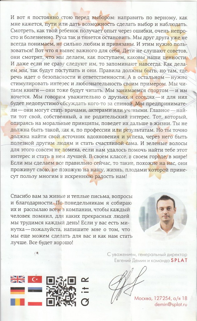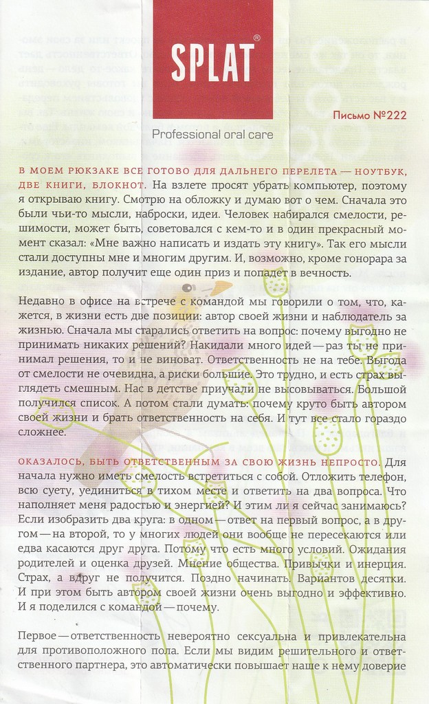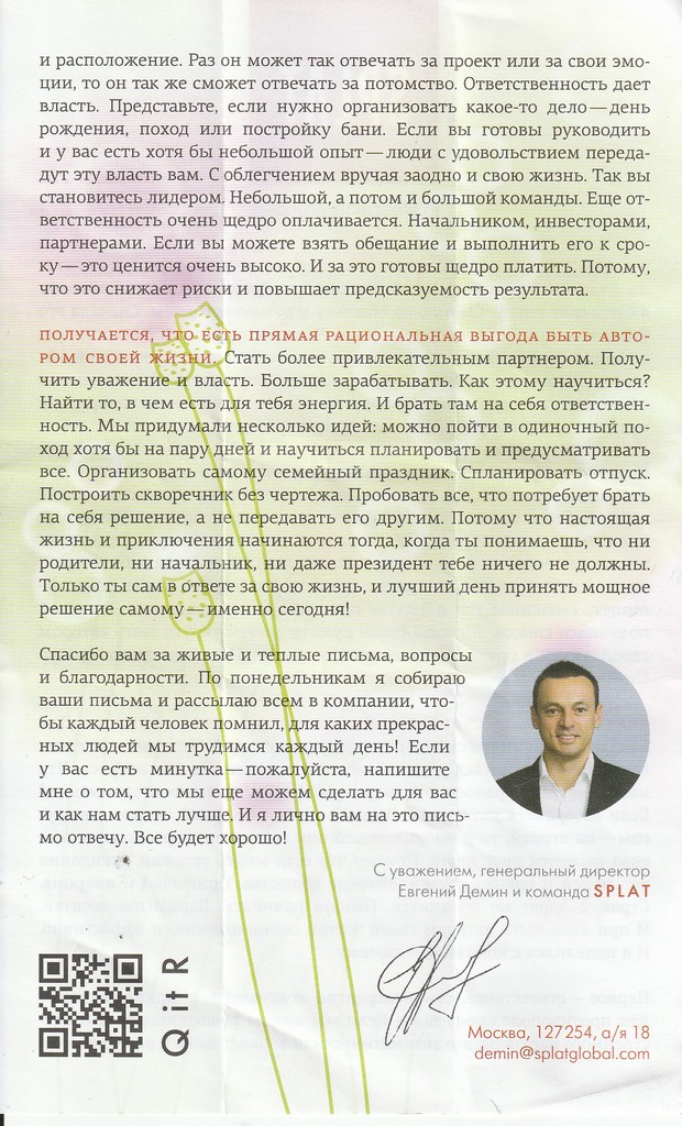 Любопытный способ поддержания лояльности к зубной пасте «Сплат» использует её производитель, возглавляемый Евгением Дёминым. В каждой упаковке пасты вы найдёте письмо основателя на ту или иную тему.