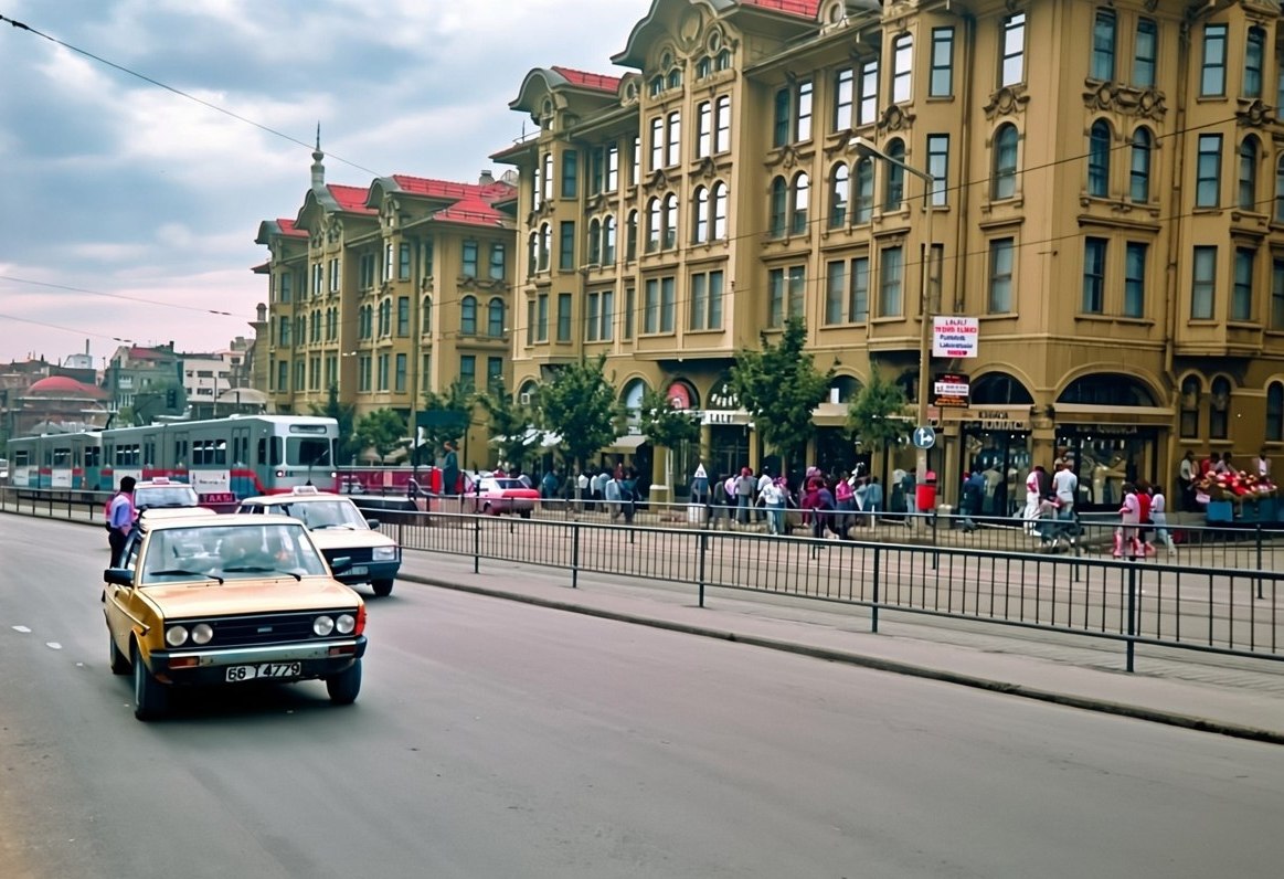 Главная магистраль Ordu Caddesi в квартале Laleli. Крупное жёлтое здание с красными кровлями – исторические апартаменты Harikzedegân (Tayyare) Apartmanları 1922 года. Сейчас это пятизвёздочный отель Crowne Plaza Istanbul Old City). По центру идёт линия трамвая Т1. Скоростной трамвай выглядел ультрасовременно по сравнению с советскими.