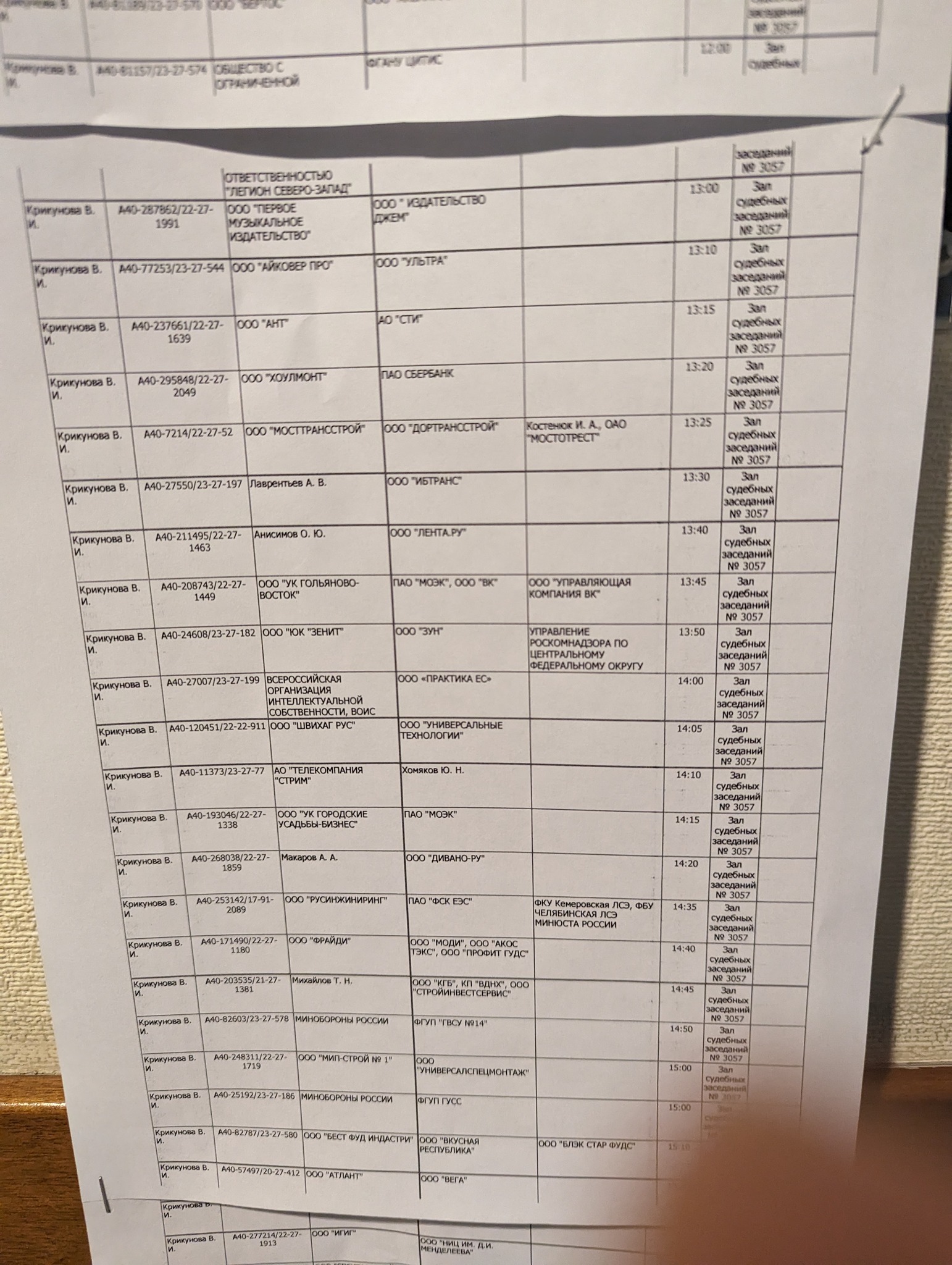 А вот то расписание всего одной судьи. У них в арбитраже полный аншлаг. Я не представляю, как головы выдерживают. И таких листов висело на двери три или четыре штуки. Понятное дело, что идут не только рассмотрения по существу, но и собеседования, переносы, но мозг от такого вскипит у любого.