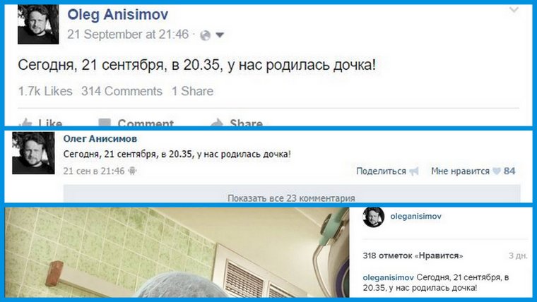Эксперимент. Первичный пост без фото о том, что у меня родилась дочка, набрал в Facebook 1767 лайков и 314 комментариев (верхний скриншот). Ровно такой же пост в «Вконтакте» — 84 лайка и 23 комментария (средний скриншот).